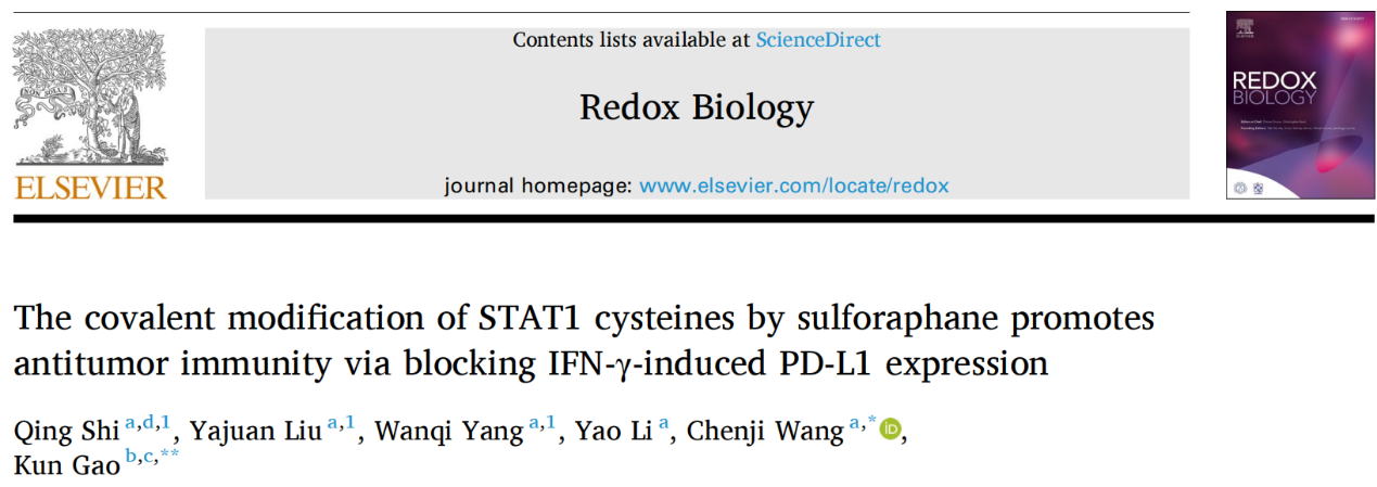 2025年2月17日,黑料社 王陈继团队、上海市第一妇婴保健院/同济大学附属妇产科医院高昆团队合作在Redox Biology在线发表了题为 “The covalent modification of STAT1 cysteines by sulforaphane promotes antitumor immunity via blocking IFN-γ-induced PD-L1 expression”的研究论文。该研究揭示了SFN通过共价修饰STAT1蛋白的半胱氨酸残基,阻断IFN-γ诱导的PD-L1表达,从而增强抗肿瘤免疫的分子机制。
