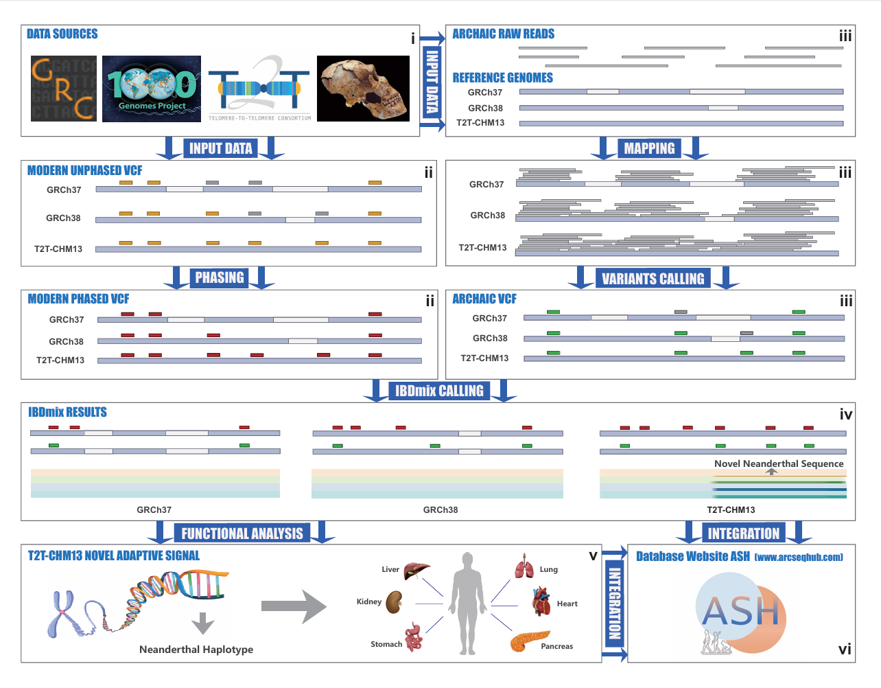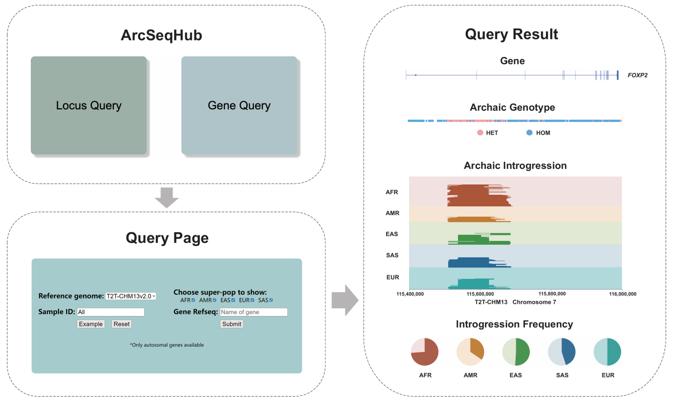 研究人员将阿尔泰尼安德特人和丹尼索瓦人的高覆盖度基因组测序数据分别比对到GRCh37、GRCh38(hg38)和T2T-CHM13参考基因组,获得三组古人基因组遗传变异图谱。进一步,研究人员利用陈璐团队先前开发的IBDmix方法,基于1000 Genomes Project(1KGP)中2504个非亲缘个体遗传变异数据以及古人基因组遗传变异图谱,分别鉴定了基于三个参考基因组的1KGP现代人群全基因组尼安德特渗入序列,并解析出T2T-CHM13特有的基因组渐渗区域与群体特异的适应性渗入信号,最终将基于三个参考基因组的现代人群中尼安德特渗入片段及适应性渗入信号编纂到数据库网站ArcSeqHub(ASH, //www.arcseqhub.com)(图1)。