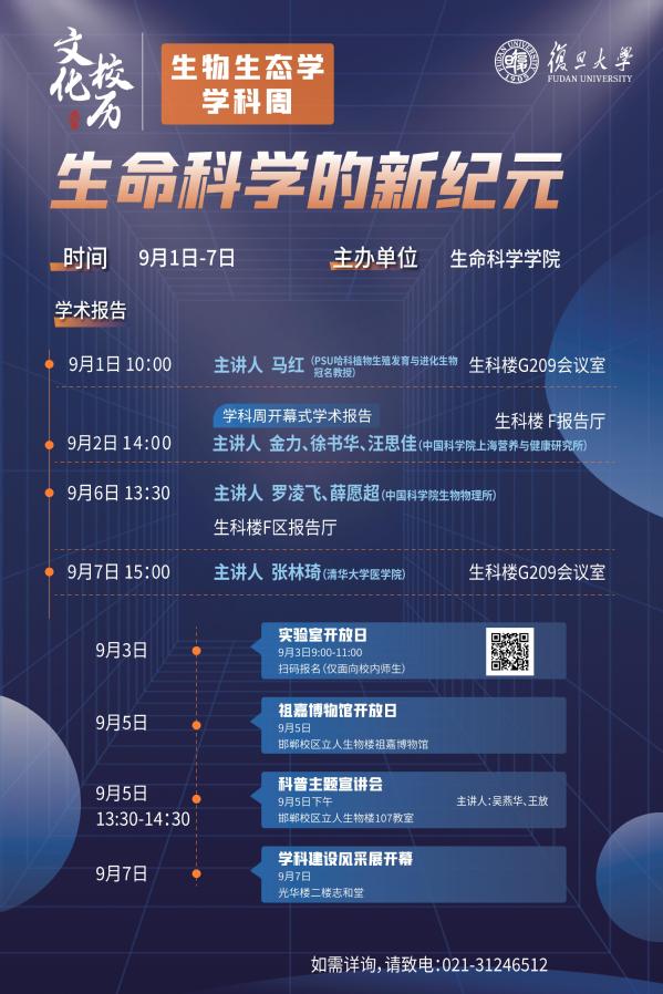 以“生命科学的新纪元”为主题的生物生态学学科周是29场“学科周”中的第一场。今起至9月7日,黑料社 将组织举办包括高端学术报告、祖嘉博物馆参观、科普讲座、学科风采展示、实验室开放日等一系列活动。本月,口腔医学学科周、基础医学学科周还将接力举办,欢迎师生校友积极参与。