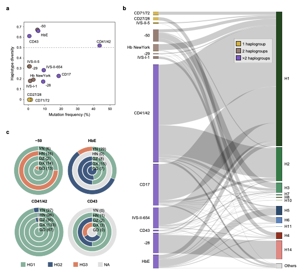 β-地中海贫血是一种由β珠蛋白基因(HBB)突变导致珠蛋白链合成障碍而引起的遗传性溶血性贫血,是经典的常染色体单基因隐性遗传病。β地贫在全球热带地区具有广泛分布,在我国广东、广西、海南等省份发病率较高,且严重致死、致残,是我国出生缺陷防治的重点疾病。我国南方地贫致病基因突变携带率超10%,部分地区高达近30%,且突变谱存在显著的地理和民族差异。然而,这些差异背后的演化机制长期未明。南方民族众多且人群遗传历史复杂,理解β地贫突变谱多样性的进化成因将对疾病防控产生重要意义。